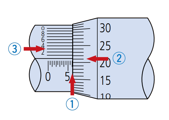 帶游標刻度的千分尺在套管基線的上面有游標刻度,此時的讀數(shù)方法如下圖所示: