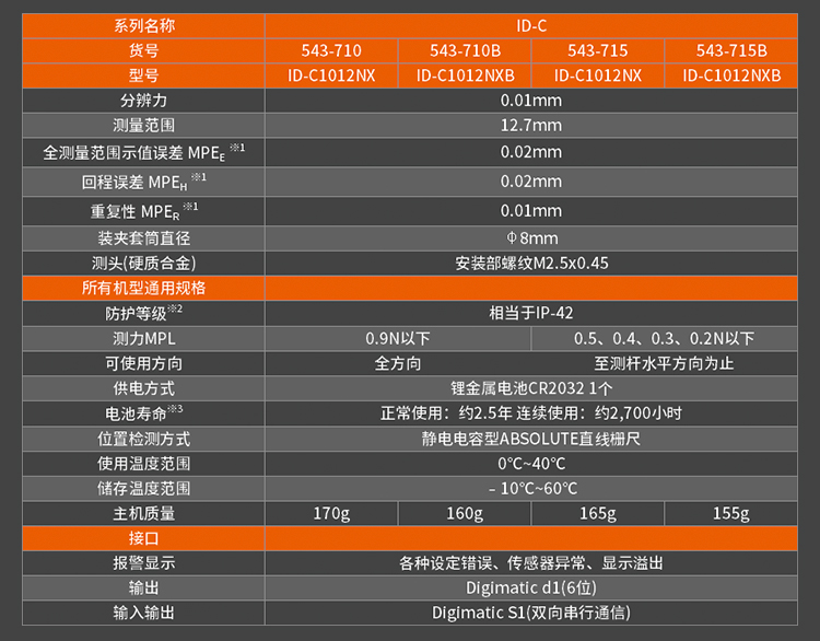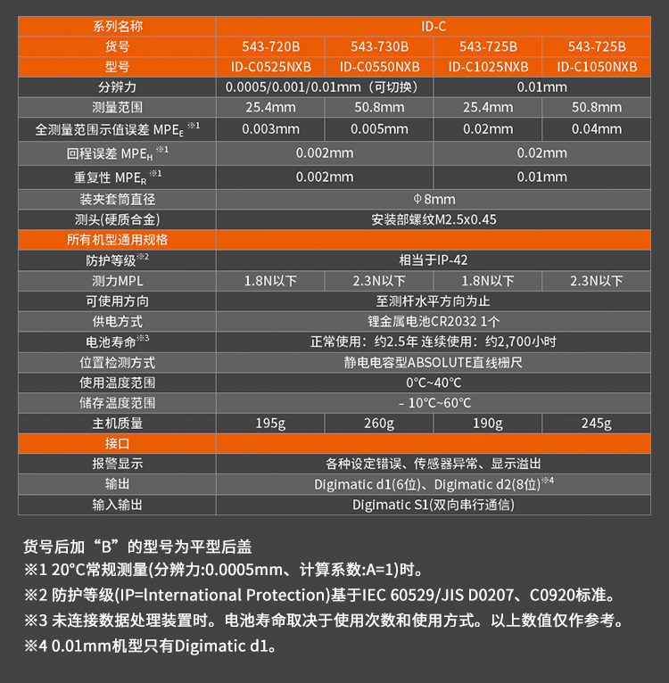 三豐數顯百分表543-781B/794B/790B的塵/水防護等級達到IP53 (只限分辨力0.001mm型),使用紐扣式電池(SR44)。......